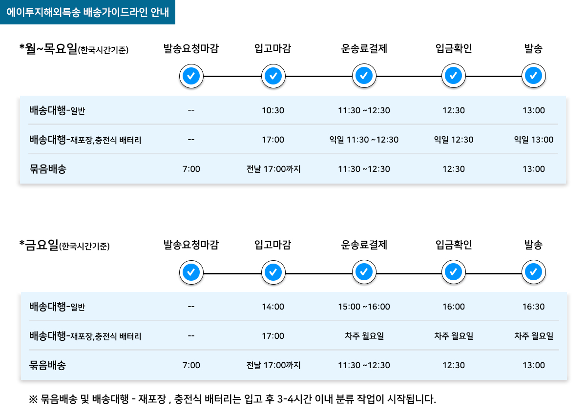 월-목 : 운송료 결제 마감(한국시간) 11:30-12:30까지 입금되는 건에 한해 당일 발송이 가능합니다.