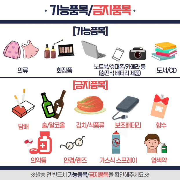 ※ 금지 물품을 고의 또는 실수로 발송시 발생하는 모든 법적 책임은 신청인에게 있습니다. 이 점 참고하셔서 신청 바랍니다.