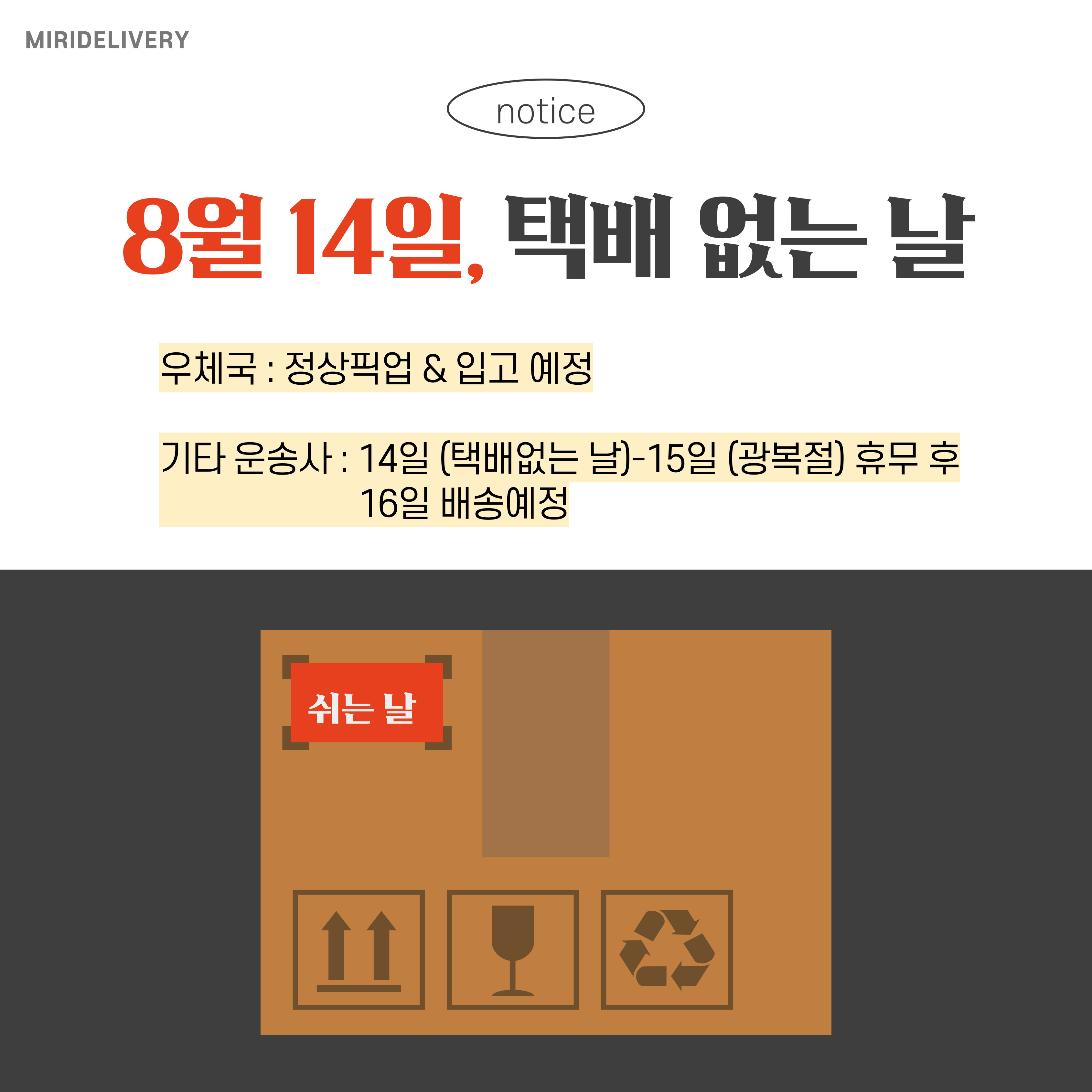 8/14(수)는 택배 없는 날로 우체국을 제외한 모든 택배사의 입고가 중단되오니 참고하시기 바랍니다