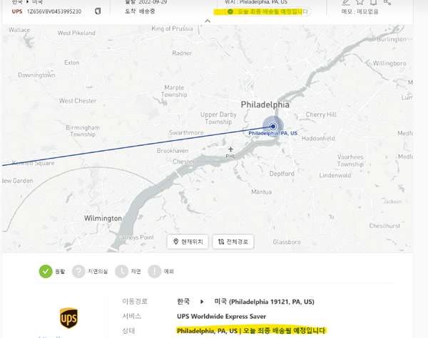 광명시에서 한국시간 9/28일(수) 오전 우체국 택배로 보냈는데... 미국 시간 9/30일(금) 오후에 도착 했다해요...